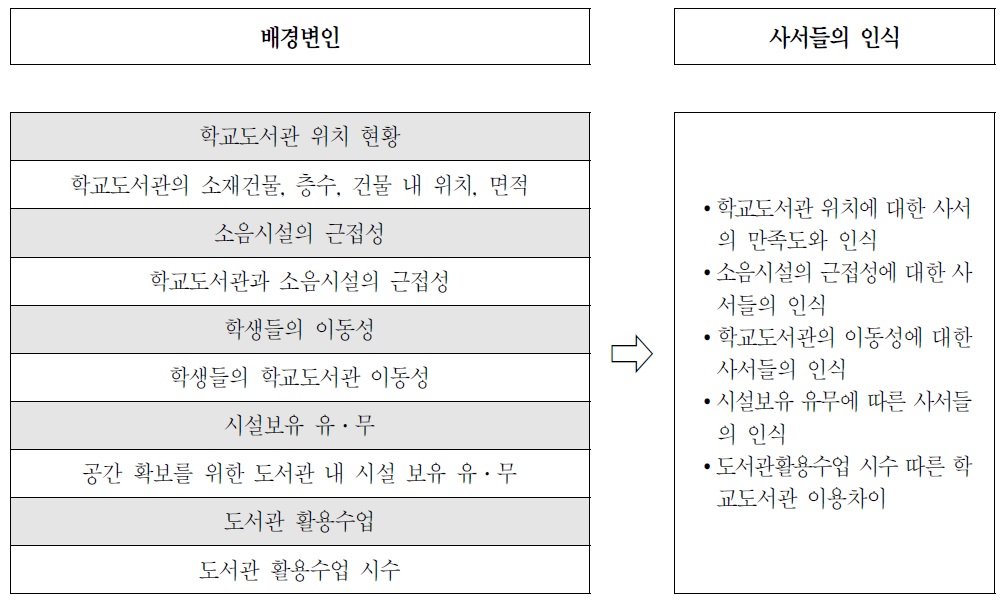 학교도서관 위치 및 활용현황에 대한 사서들의 인식을 조사하기 위한 본 연구의 모형을 도식화하면
