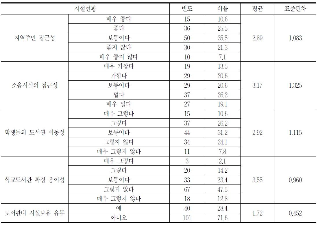 응답자의 학교도서관 시설현황을 조사하였으며, 그 결과는