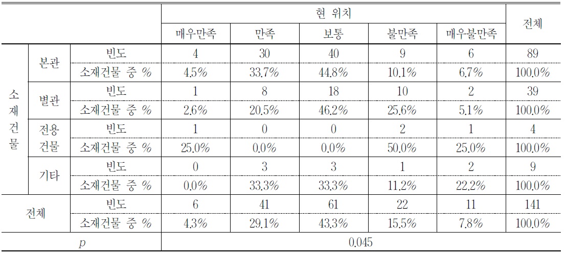 <표 9>. 학교도서관의 소재건물에 따른 현 위치 만족도