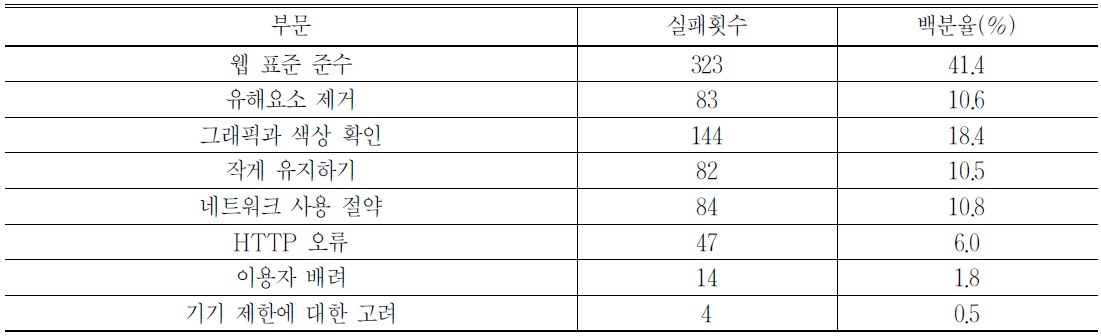 모바일OK 부문별 실패횟수를 살펴보면, 총 781건의 실패횟수 중 ‘웹 표준 준수’를 위반하여 실패한 사례가 총 323건으로 가장 많았다. 그 다음은 ‘그래픽과 색상 확인’ 부문에서 144 건 실패하였고, ‘네트워크 사용 절약’, ‘유해요소 제거’, ‘작게 유지하기’가 그 뒤를 이었다(