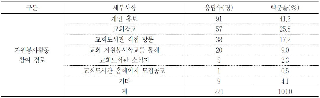 자원봉사활동에 참여한 경로를 조사한 결과, 개인 홍보(직원, 자원봉사자, 친구, 지인)가 91명(41.2%)으로 가장 많았으며, 다음으로 교회광고 (주보광고, 홈페이지)를 통해서가 57명(25.8%) 을 차지하였다(