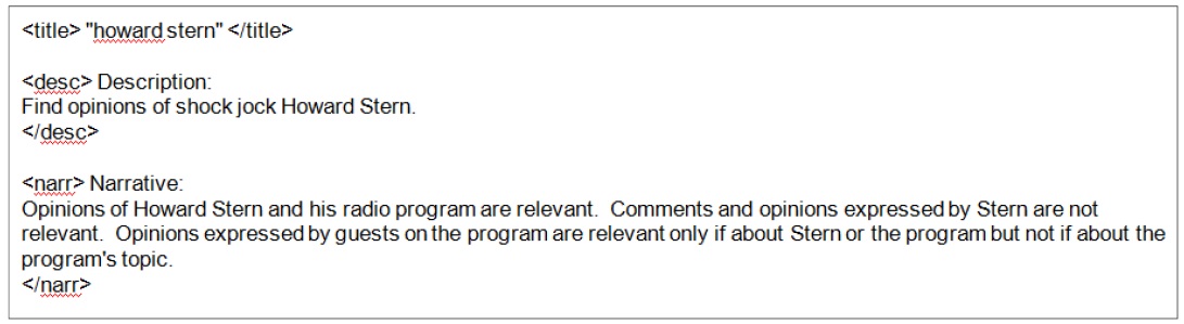 The Blog06 corpus includes a crawl of feeds (XML), associated permalinks (blog postings in HTML), and feed homepages captured from December 2005 through February 2006. Among the blog document set of 100,649 feeds (39GB), 3.2 million permalinks (89GB), and 325,000 homepages (21GB), only the permalinks were judged for relevance in the opinion finding task. TREC assessed a pool of unique results created from merging top ranked blogs from submitted results. To be considered relevant, a blog had to be on topic and contain an explicit expression of opinion or sentiment about the topic, showing some personal attitude either for or against. Each of 50 test topics, which were constructed by TREC using queries from commercial blog search engines (e.g., BlogPulse and Technorati), consists of title (phrase), description (sentence), and narrative (paragraph) fields. For our study, we generated short queries from the title field and long queries from all three fields. An example of the TREC blog topic is shown in